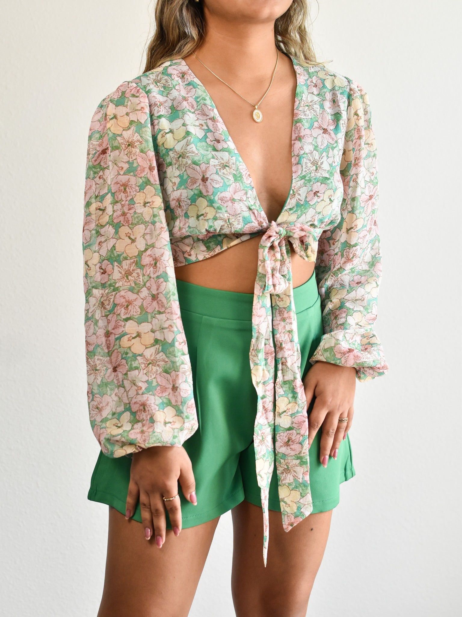 Conjunto de blusa y pantalones cortos con estampado floral verde
