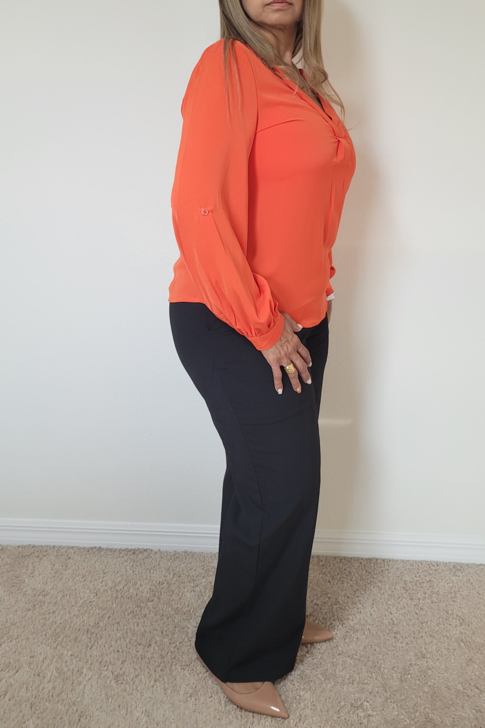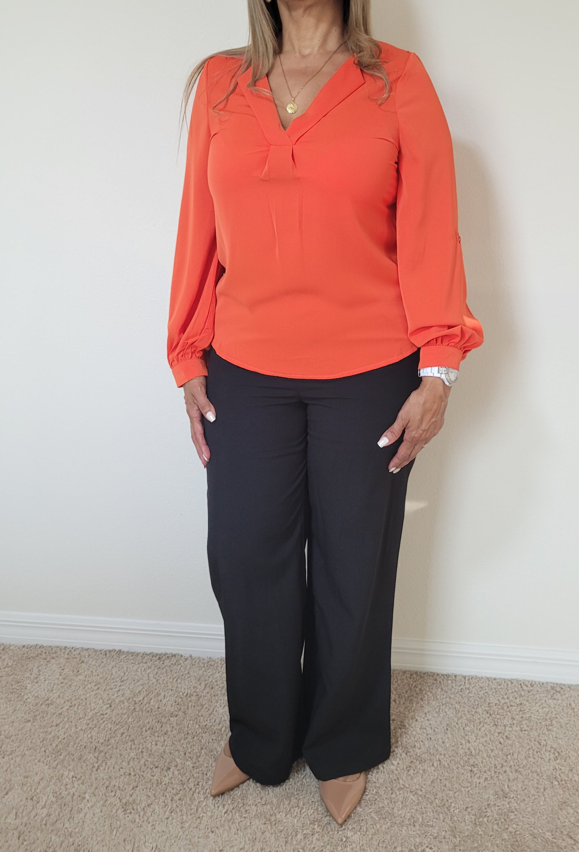 BLUSA DE MANGA LARGA ENROLLADA CON CUELLO EN V LISO